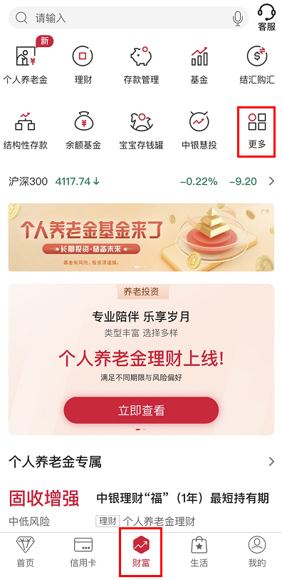登錄手機(jī)銀行,點(diǎn)擊“財(cái)富”-“更多”。