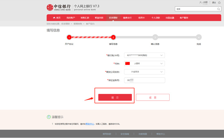 填寫信息-期貨公司選擇齊盛期貨-輸入保證金賬號(hào)-提交。